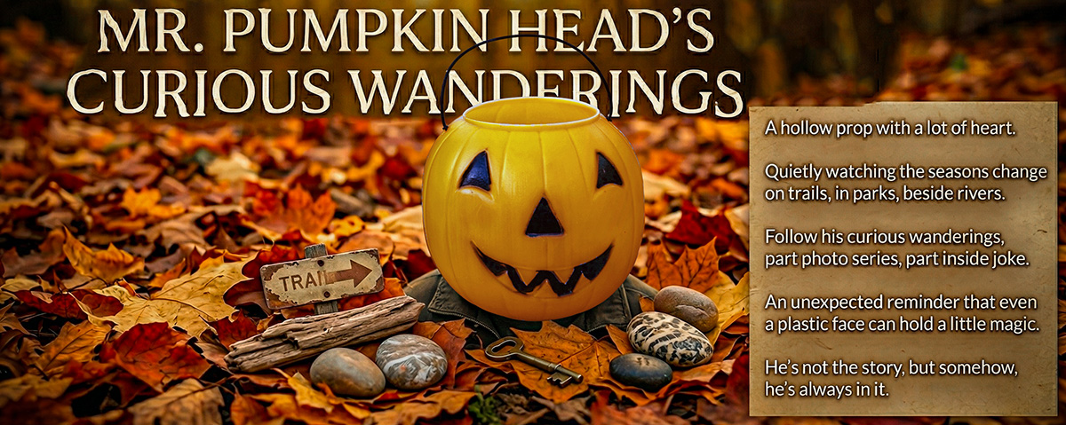 A hollow prop with a lot of heart. Mr. Pumpkin Head has been showing up where he doesn’t belong for years—on trails, in parks, beside rivers, under trees—quietly watching the seasons change. These posts follow his curious wanderings, part photo series, part inside joke, part unexpected reminder that even a plastic face can hold a little magic. He’s not the story, but somehow, he’s always in it. He would also want you to check out his images also.